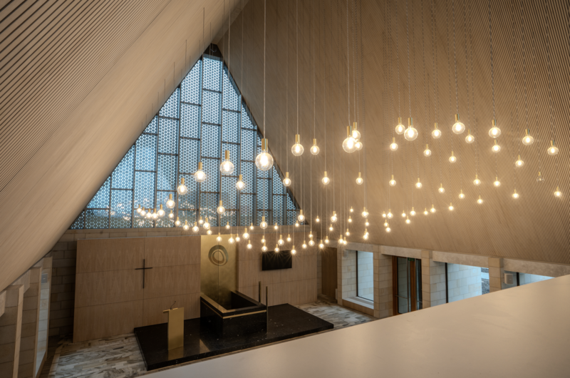 Jedlové dřevo akustických panelů má také výraznou estetickou roli. Interiéru propůjčuje přirozenou strukturu a rytmus, opticky jej zjemňuje a posiluje jeho důstojný charakter. Moderní výraz prostoru navíc podtrhují přírodní tóny světlého dubu a pískovce.