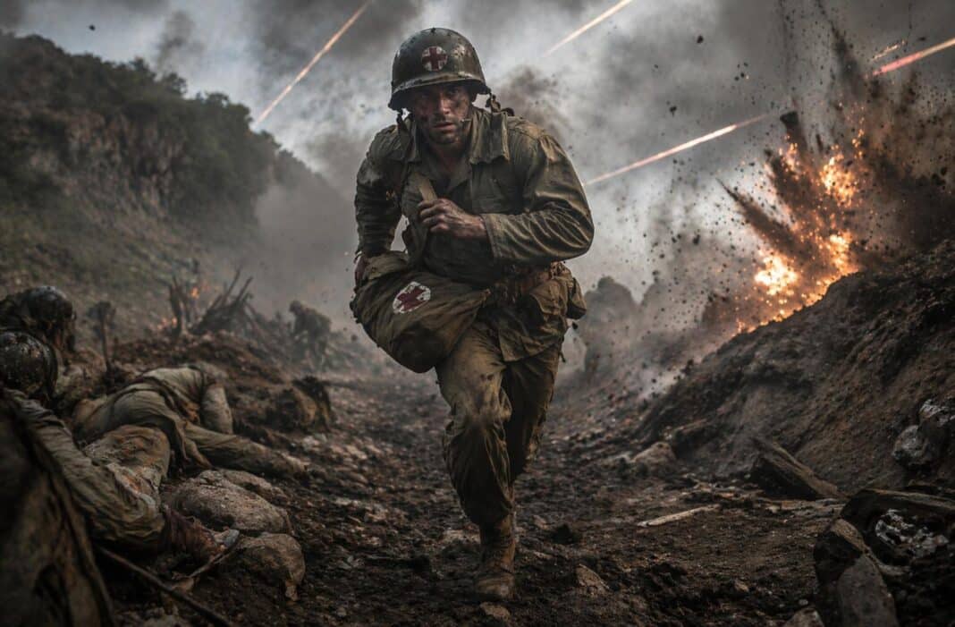 První výstřely na plošině rozpoutaly peklo. Doss se plazil pod svištícími kulkami a ošetřoval raněné. Jen pro vysvětlení: váleční zdravotníci nosili zbraň, jejich pozice se však označovala jako „nebojová“. Chránit je měla jednotka. Útoky na zdravotníky byly považovány za válečné zločiny. Japonci na ně však útočili úmyslně, aby podkopali morálku nepřítele a zabránili záchraně životů.