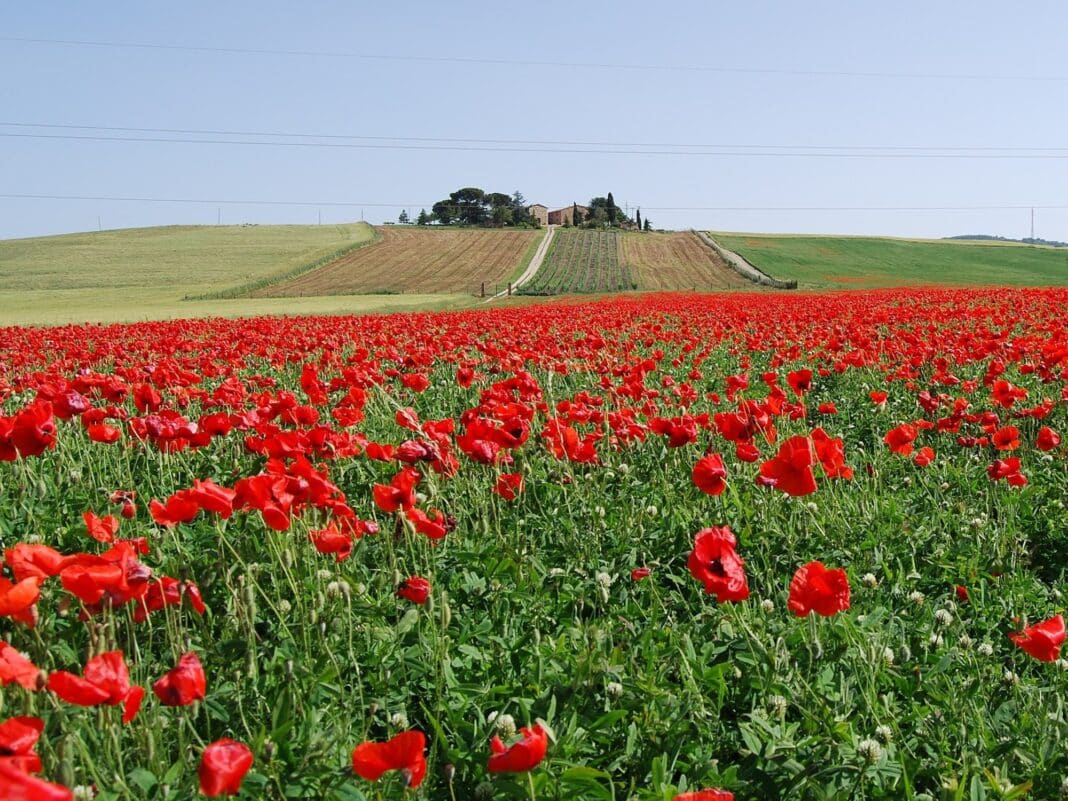 Na opačném konci Evropy nabízí trochu jinou podívanou Toskánsko. Mezi vinicemi a cypřiši se od dubna objevují plané máky a barví krajinu do červena. Nejkrásnější je to v oblasti Val d’Orcia– ideální na piknik nebo túru po staré poutní cestě Via Francigena.