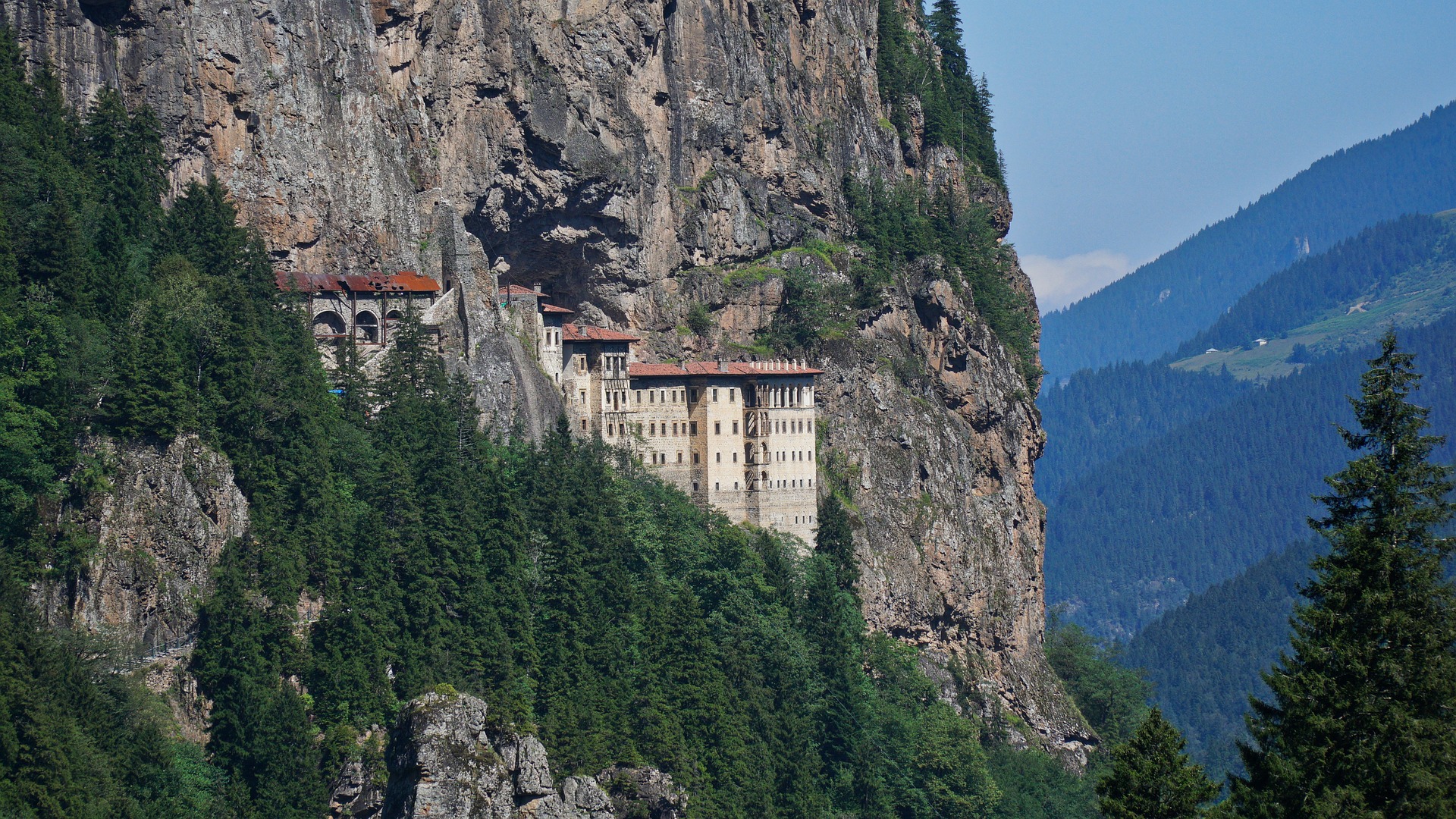 Strmé stěny Pontského pohoří tu ukrývají kaple, dvory, knihovnu i zvonici. Areál vyrostl kolem jeskynního „skalního kostela“, jehož stěny pokrývají stovky let staré fresky. Příběh místa sahá ke křesťanským legendám i k realitě byzantské a osmanské správy. Dnes se Sümela uchází o zápis na seznam světového dědictví UNESCO.