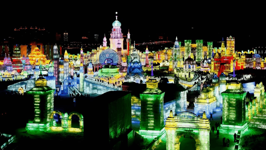 Harbinský ledový a sněhový svět začínal jako místní festival. Postupně se ale změnil v sezónní tematický park, který se každou zimu znovu přestaví. A není to jen pár soch na okraji města. Je to areál s oddělenými vchody, dopravními zónami, pěšími konstrukcemi a místy, kde se dá trávit dlouhý čas. Hlavně večer, kdy osvětlení úplně změní to, jak celý prostor působí.