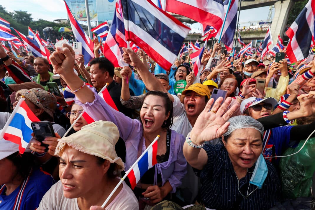 Sobotní demonstrace u památníku Victory Monument byla největší od nástupu vládní strany Pheu Thai k moci v roce 2023. I přes silné deště zaplnily ulice tisíce lidí, kteří mávali thajskými vlajkami, nesli deštníky a transparenty s nápisy jako „Premiérka je nepřítel státu“.