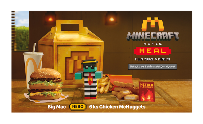 Fanoušci si mohou vytvořit vlastní A Minecraft Movie Meal. Vybrat si mohou Big Mac nebo šest Chicken McNuggets a k tomu dostanou velké hranolky, velký nápoj, omáčku Nether a jednu ze šesti sběratelských figurek.