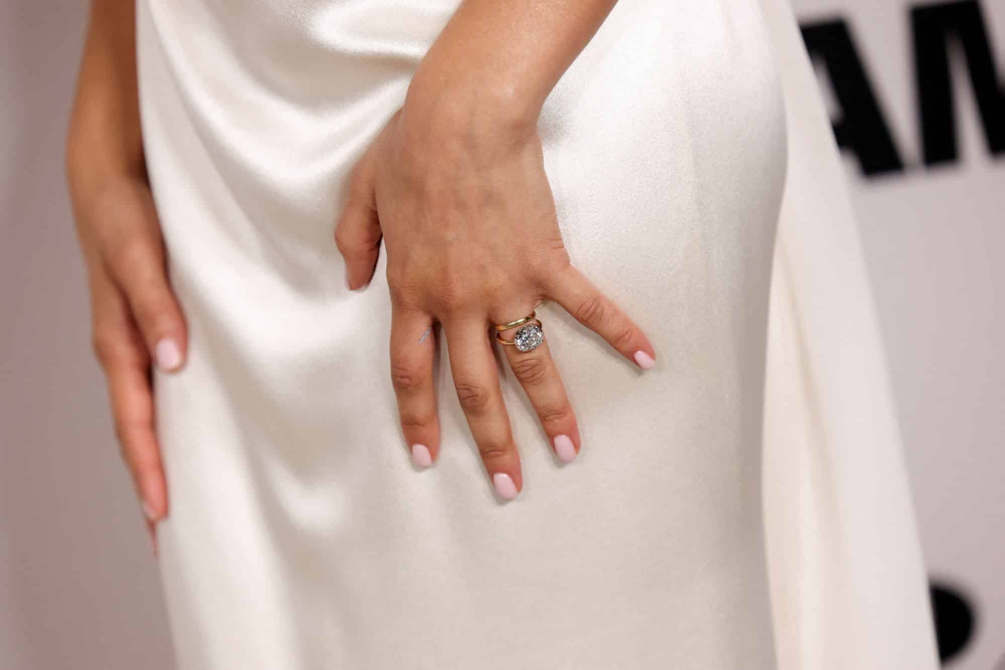 Na červený koberec dorazila v korzetových bílých šatech Vivienne Westwood, které už jednou oblékla na Oscary v roce 2015. Tentokrát se ale pozornost neupírala jen na šaty. Kombinace zásnubního prstenu a dalšího zlatého kroužku okamžitě rozjela novou vlnu otázek, jestli už svatba skutečně neproběhla.